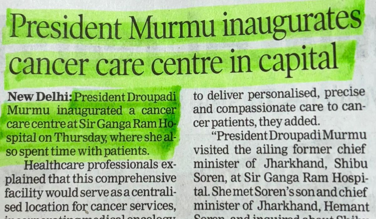 The Hon'ble President of India, Smt. Droupadi Murmu, officially inaugurated the new Cancer Care Centre at Sir Ganga Ram Hospital, New Delhi, on 26 June 2025. A particularly touching moment of her visit was her interaction with patients, including several brave children fighting with cancer. The state-of-the-art centre is a major leap forward for quality cancer care in the capital, offering comprehensive medical, surgical, and radiation oncology services.